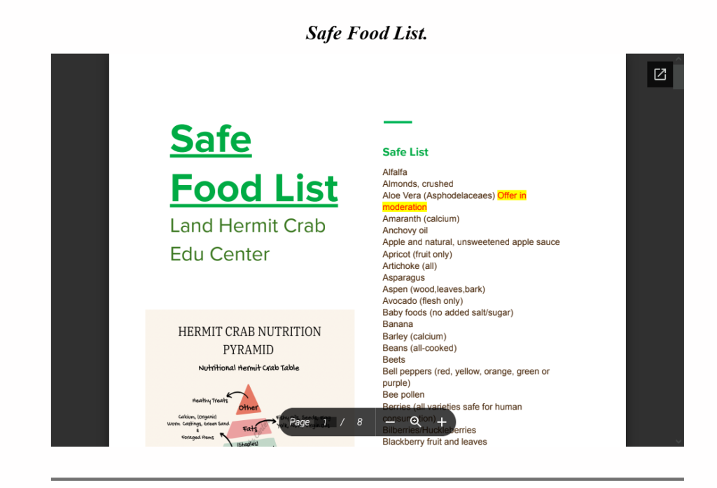 “Safe” and “Not Safe” pdfs downloaded from landhermitcrabeducenter.com, land-hermit-crab-edu-center.com; “Safe”, “Not Safe”, and Moss files – The Crabby Hermit (Hermit Crab Care and Education) “TM” Facebook Group Files. The “Safe” & “Not Safe” files from all locations were identical.